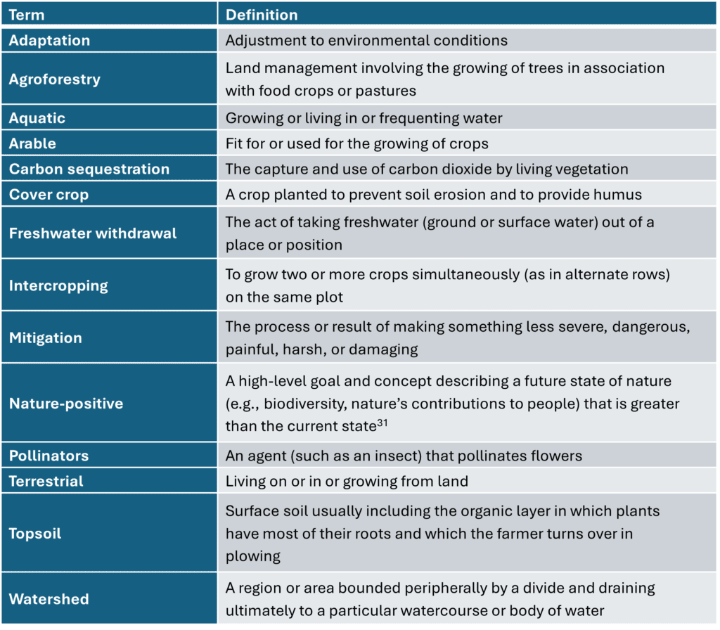 - SBTN (2022). SBTN Glossary of Terms. Available at: https://sciencebasedtargetsnetwork.org/wp-content/uploads/2023/05/SBTN-Steps-1-3-Glossary_2023.docx-1.pdf. Last accessed September 24, 2025.